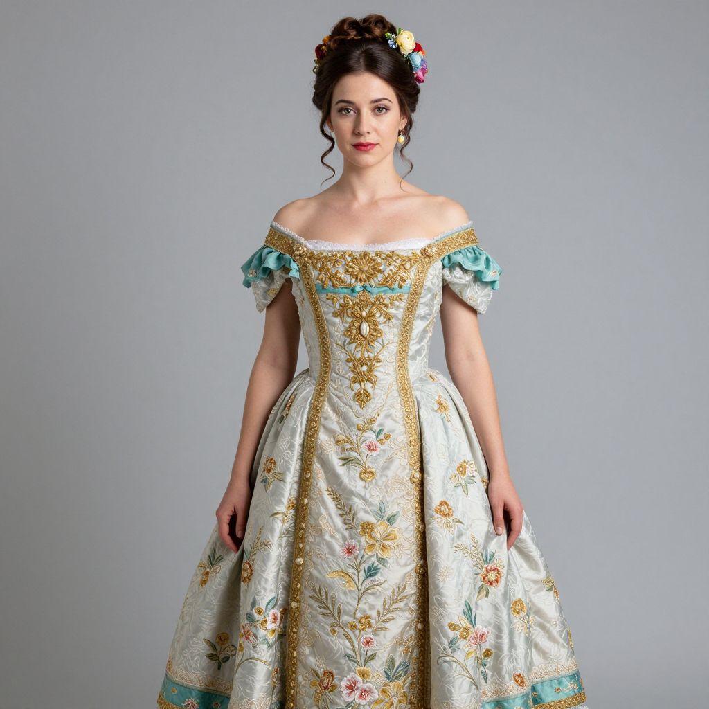Elegant 1833 carriage dress featuring off-the-shoulder design, gold embellishments, floral embroidery, and teal accents, worn by a woman with a styled hairstyle adorned with colorful flowers.