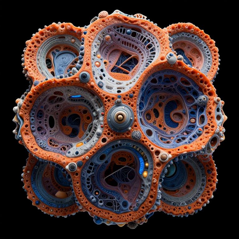 The image showcases a highly intricate, biomechanical space telescope composed of living tissues, lab tissue, and biosubstrate, utilizing bioengineering and organic machine techniques. The structure exhibits a fractal shape, characterized by a complex, self-similar pattern that repeats at different scales. The telescope's surface is adorned with a myriad of textures, including organic, cellular, and mechanical elements, creating a hyperrealistic and detailed appearance. The colors are a vibrant mix of oranges, blues, and grays, with the orange hues dominating the outer layers and the blues and grays forming intricate patterns within the telescope's core. The spatial relationships within the image are dynamic, with various layers and components interlocking and overlapping, giving the impression of depth and complexity. The overall composition is visually striking, with the telescope appearing to be both a biological and mechanical marvel, blending organic and artificial elements in a seamless, almost otherworldly manner.