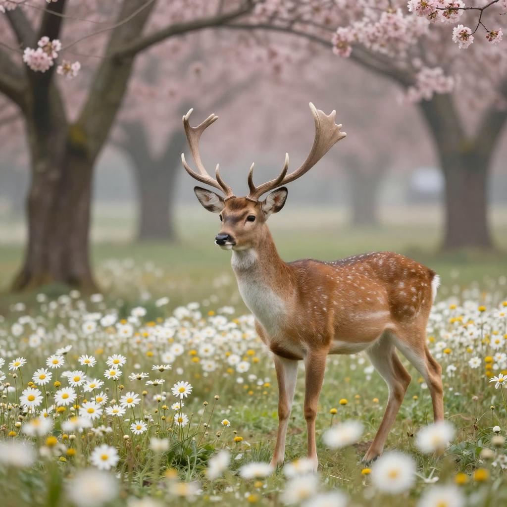 A graceful deer with antlers standing in a vibrant meadow filled with white daisies and yellow centers. Surrounding the deer are tall trees with pink blossoms, set against a soft, misty background.