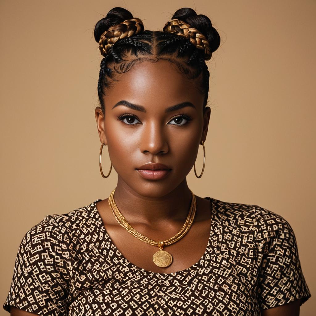 French braid hairstyle, photo-realistic portrait of a young black woman, medium brown skin, double bun hairstyles with long braids, wearing a brown patterned top, gold necklace with pendant, small hoop earrings, neutral brown background, soft lighting, serious expression, close-up, realistic ures, detailed hair, African descent, elegant, traditional hairstyles, 3/4 view, warm color palette