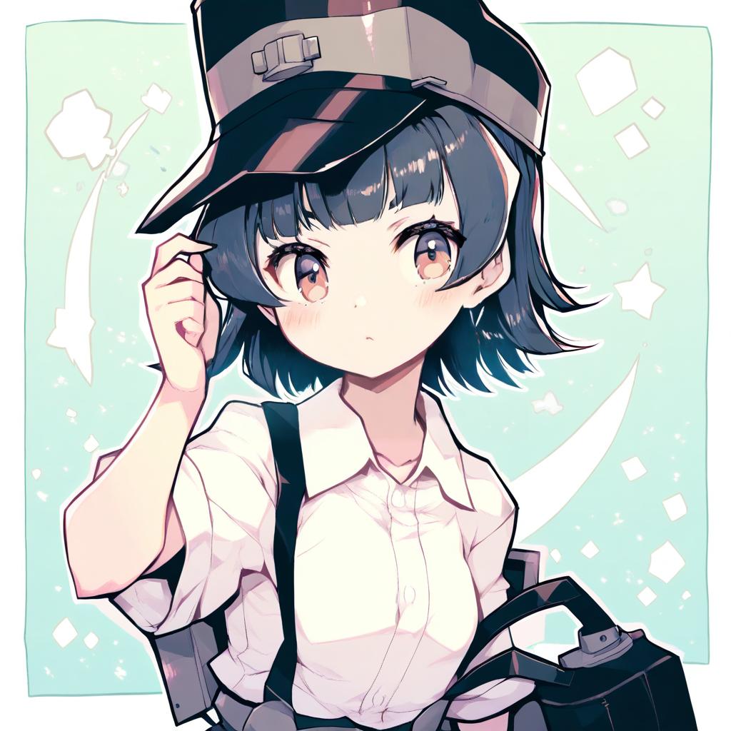 Arare (kancolle), kantai collection, 1girl, brown eyes, short hair, black hair, hat, white shirt, by artist himiya jouzu, animagine
