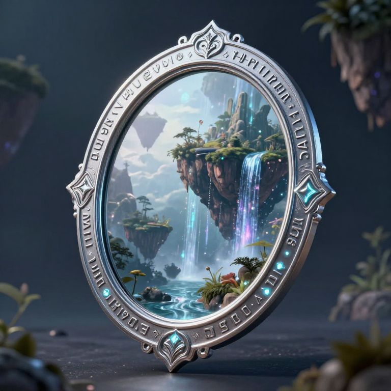 A digital artwork depicting an ornate, circular, silver-framed mirror with intricate patterns. The mirror reflects a fantastical landscape featuring floating islands, cascading waterfalls, and lush vegetation. The background is a dark, starlit sky with faint, distant clouds. The frame has glowing blue accents and Latin-like inscriptions. The reflective surface shows vibrant blues and greens, contrasting the dark surroundings. The scene is set on a rocky, plant-covered surface with blurred foliage in the foreground, adding depth. The overall style is highly detailed and fantasy-themed, with a magical, surreal atmosphere.
