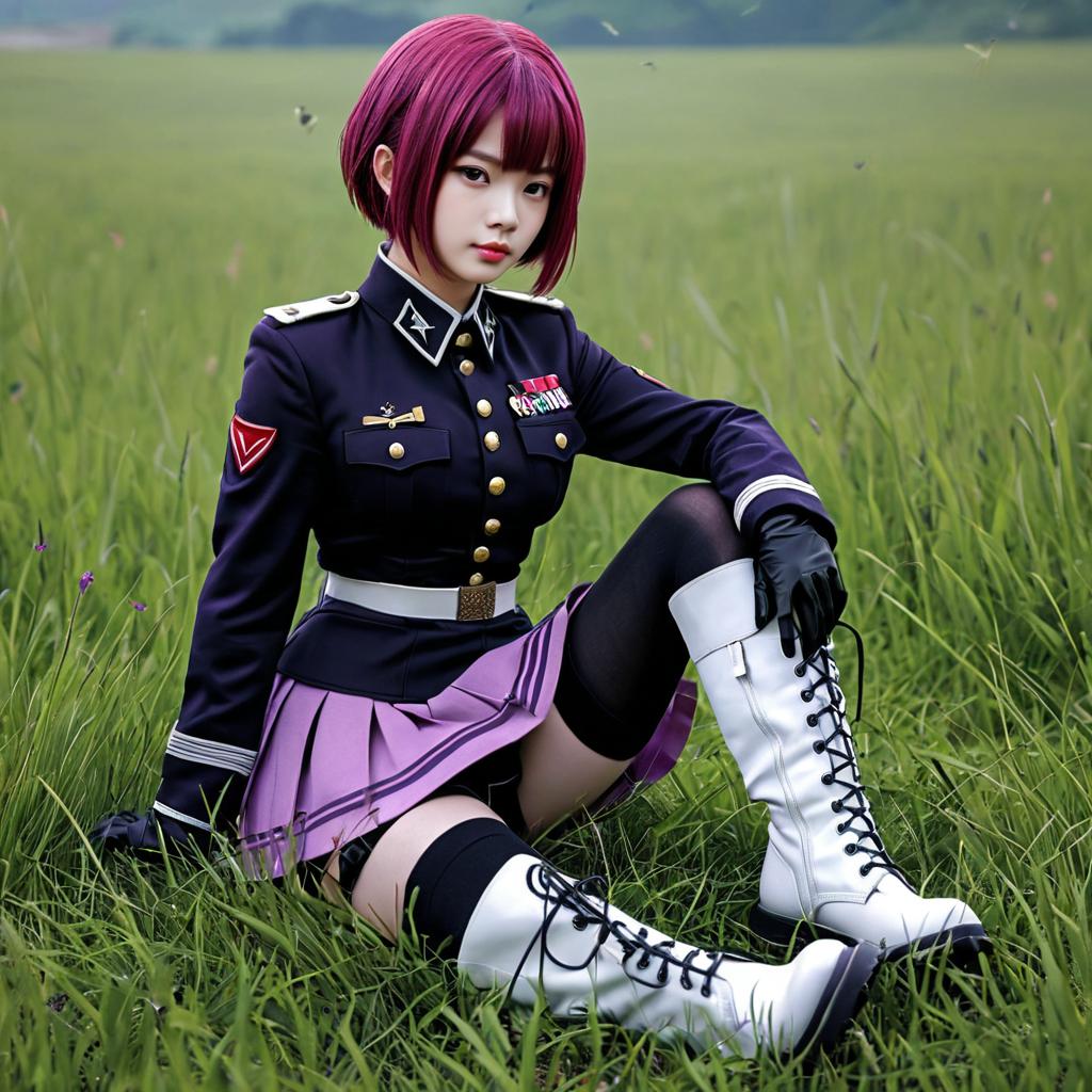 Masterpiece, best quality, highres, 1girl, solo, pink skirt, military uniform, short hair, ahoge, black thighhighs, red hair, purple eyes, purple hair, long sleeves, field, grass, wariza, white boots