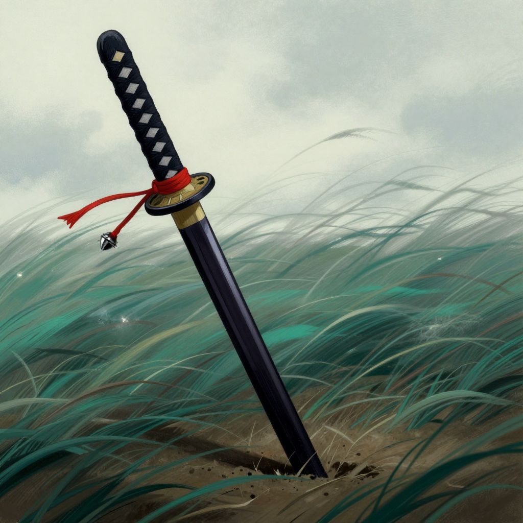 Digital illustration of a black katana with diamond-patterned hilt, red tassel, and gold guard, standing upright in swirling, teal-green grass