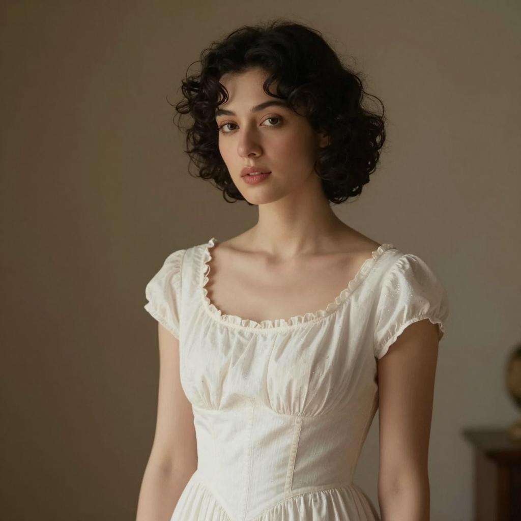 A realistic portrait of a woman with short curly black hair, wearing a white vintage-style dress with a fitted bodice, soft and warm lighting highlighting her gentle expression, muted and warm color tones reminiscent of a classic oil painting, elegant and timeless atmosphere