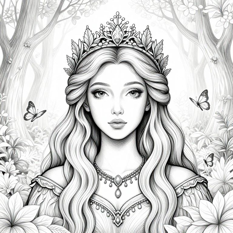 The image is a highly detailed, illustrative black line drawing of a queen of the fairies in an enchanted woodland setting. The queen's face is realistic, with intricate lines and shading that give it a three-dimensional appearance. She wears a crown adorned with delicate, leaf-like patterns and a necklace with intricate designs. Her hair is long and wavy, cascading down her shoulders. The background features a white, ethereal forest with trees and foliage, creating a sense of depth and enchantment. Butterflies and other small creatures are scattered throughout the scene, adding to the magical atmosphere. The overall composition is balanced, with the queen centrally positioned and the elements around her arranged in a harmonious manner, creating a sense of unity and wonder.