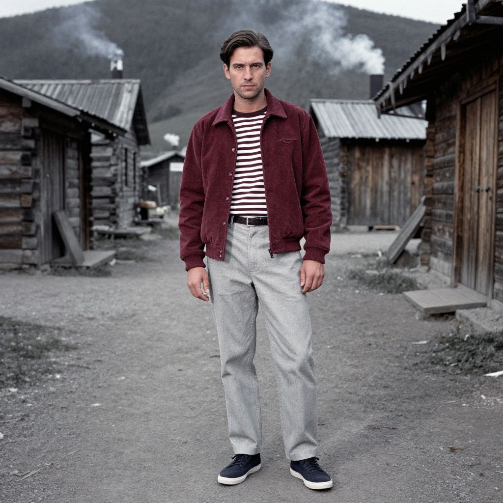 A man, maroon corduroy varsity jacket, striped long-sleeve tee, light grey chinos, navy suede sneakers, rustic wooden huts, smoke rising from chimneys, Ilford film stock, relaxed expression, vintage vibe. Man has masculine face and piercing eyes