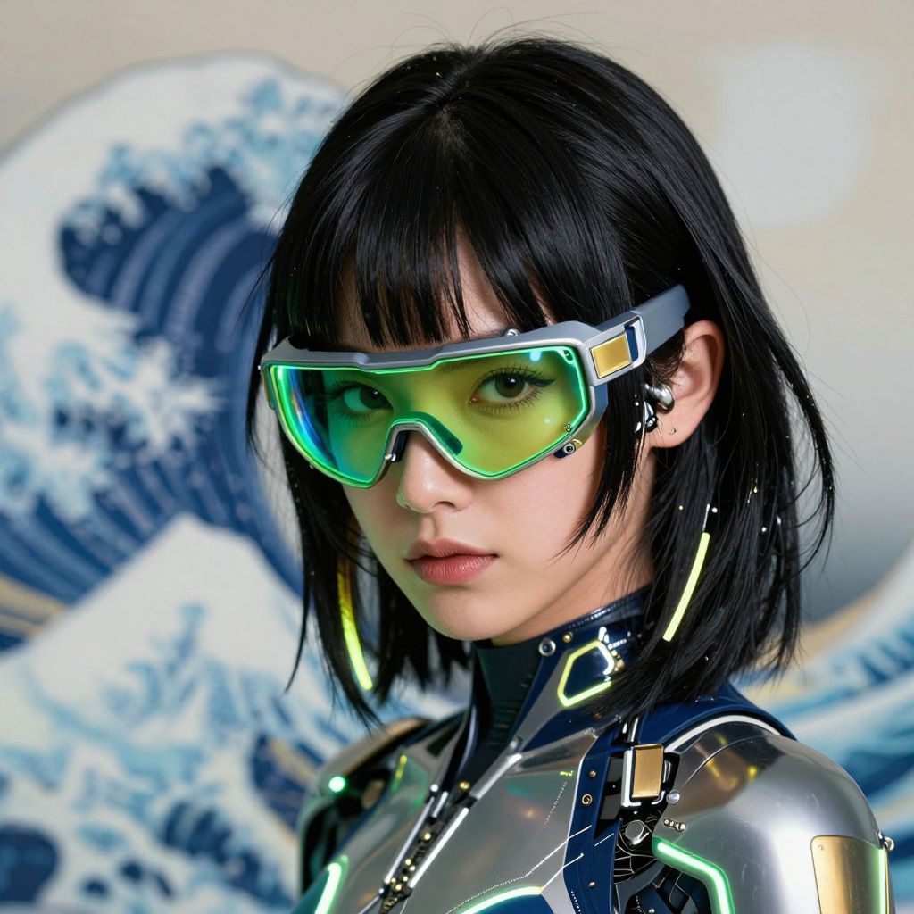 A hyper-realistic close-up portrait of a young woman with shoulder-length black hair styled in edgy, futuristic layers, adorned with glowing tips, She wears mecha eyewear with a neon green visor that transitions into iridescent shades of teal and gold, The frame is sleek, with angular edges and fine mechanical detailing, Her expression is fierce and confident, with flawless skin highlighted by the neon reflections, She wears a high-tech bodysuit with integrated LED lines and metallic panels, The background depicts a hazy rendition of The Great Wave off Kanagawa by Hokusai, its powerful waves blending seamlessly with the neon tones, amplifying her intense, defiant aura