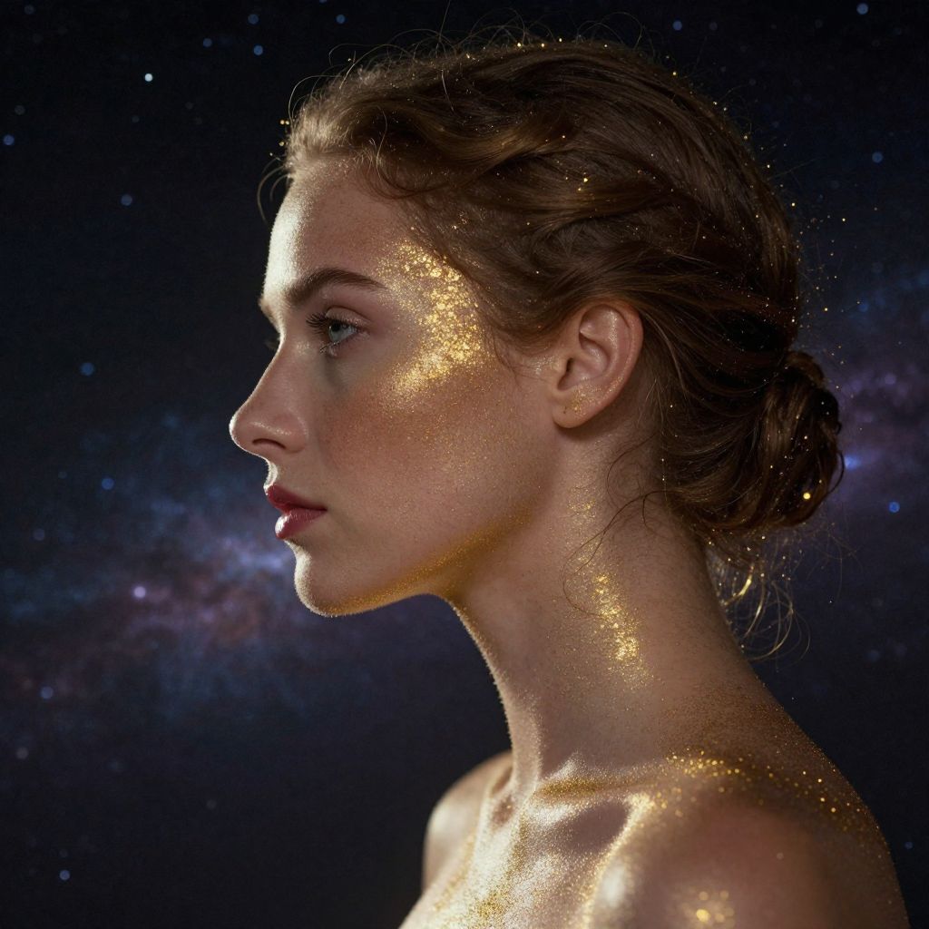 A woman's profile is bathed in a celestial glow, her skin shimmering with golden particles that seem to drift like stars against a cosmic backdrop, defying the boundaries between human form and the universe.