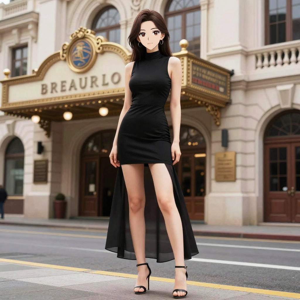 A Petite woman in a digital manga style, wearing a sleeveless black mini dress with a sheer high-low overlay and ankle-strap high-heeled sandals, standing by a historic theater. Sexy. Pretty face and beutiful eyes