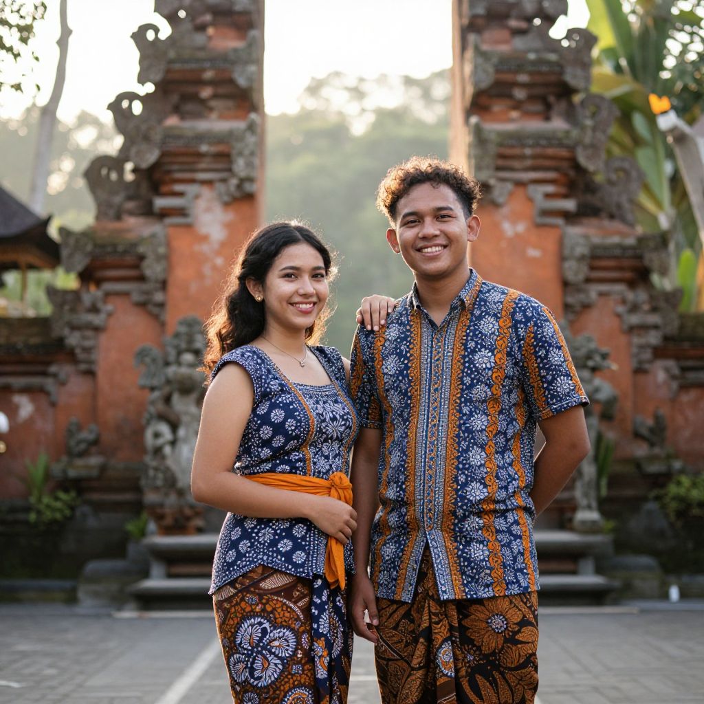 A photorealistic image of a lively young couple with light brown skin, curly hair, and warm smiles, dressed in a coordinated and trendy ethnic wear costume from Indonesia, featuring batik patterns in deep blue, orange, and white, posing in a traditional Balinese temple courtyard at sunrise, with soft golden light and lush green vegetation around them.