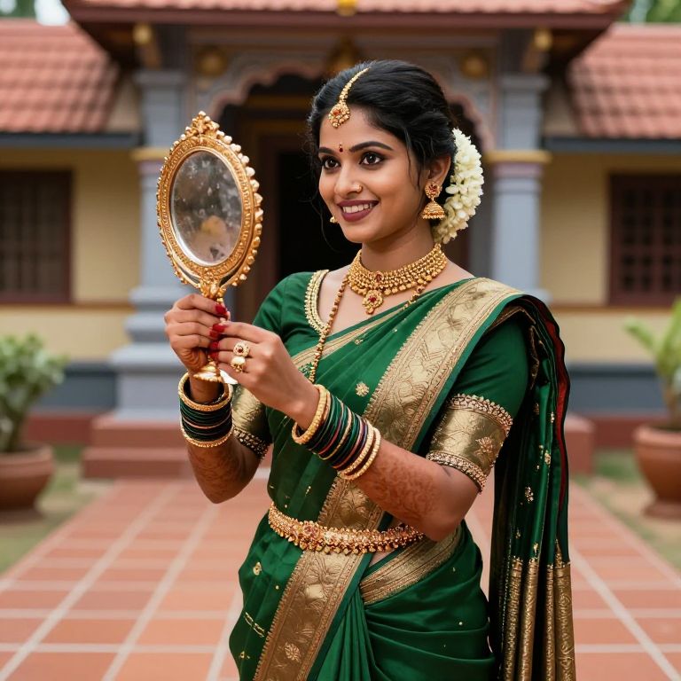 Realistic image of an Indian South Indian bride wearing a traditional silk saree in deep green with gold embroidery, standing in a village wedding setup with traditional clay tiles, colorful bangles, and a backdrop of a temple archway; the bride has a fair complexion, big brown eyes, and a joyful expression, holding a ceremonial mirror
