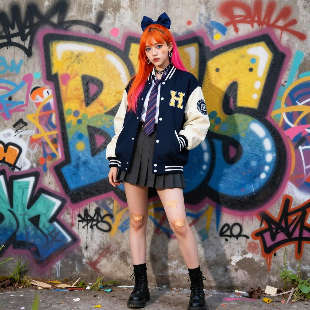 (1girl, teen, graffiti art, bandages, bandaid, bandaid_on_arm, bandaid_on_cheek, bandaid_on_face, bandaid_on_knee, bandaid_on_leg, blue_eyes, bow, earrings, full_body, hair_bow, (high_ponytail, hand in pocket), jacket, jewelry, letterman_jacket, long_hair, nail_bat, necktie, orange_hair, pink_hair, ponytail, shoes, skirt, solo), ((background many street graffiti art)), (8k, RAW photo, best quality, masterpiece:1.2), (realistic, photo-realistic:1.37), ultra-detailed, (detailed beautiful girl:1.4), 1 girl, full body shot