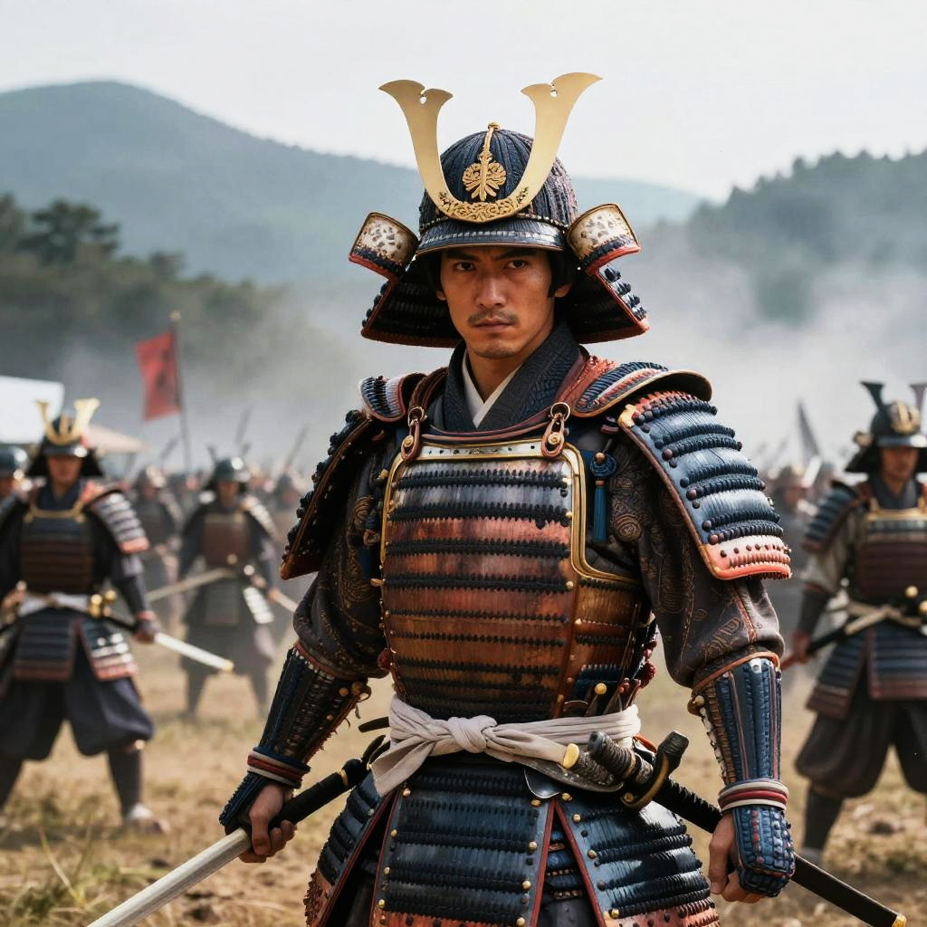 Sword wielding poses of a samurai in traditional armor, intense expression, cherry blossoms falling, ancient Japanese temple backdrop, sharp focus, rich details, moody lighting
