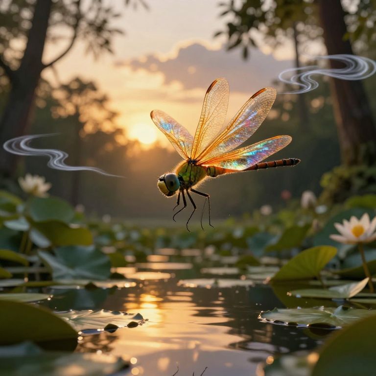 A captivating digital artwork depicts a mesmerizing dragonfly in flight above a tranquil lily pond, with wings adorned in vibrant, shimmering hues evocative of gilded patterns. The enchanting forest twilight is illuminated by the warm golden light of sunset, bathing the water's surface and verdant foliage in a serene glow. The dragonfly gracefully glides through its ethereal surroundings as wispy clouds resembling gentle waves dance above, creating an atmosphere of tranquility and magic.