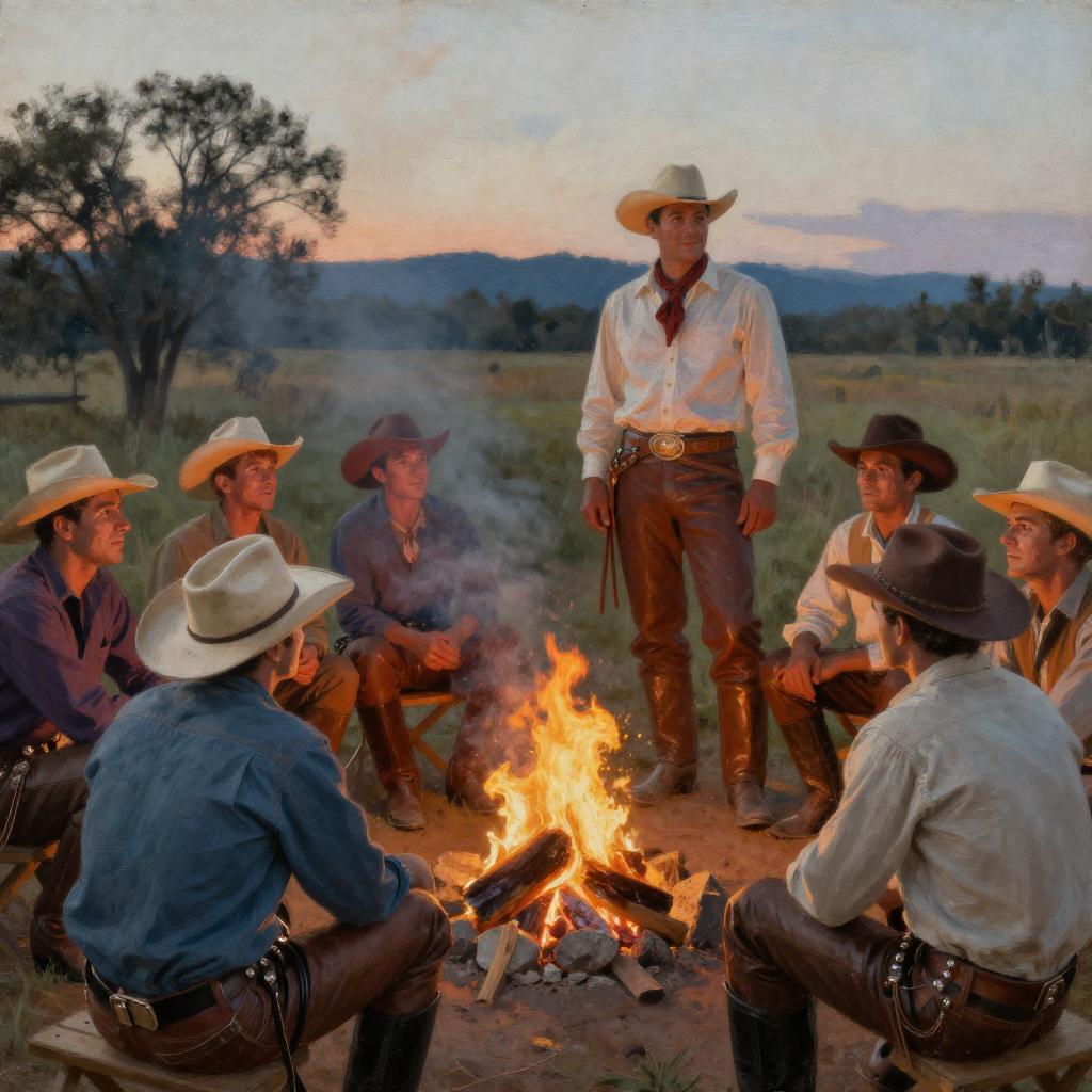 Photograph of seven cowboy men, dressed in white shirts, brown pants, and cowboy hats, gathered around a glowing campfire in a grassy field at sunset. One man stands while the others sit in a circle, looking at him. The standing man has a light beard and wears a belt with a large buckle. The background features a tree, rolling hills, and a colorful sky. The men have varying skin tones, with some wearing suspenders. Smoke rises from the fire, adding a warm, orange glow to the scene. The atmosphere is rustic and communal.