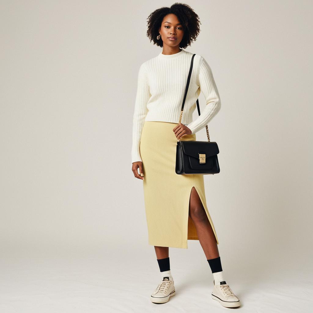 Woman, casual chic, pastel yellow mid-calf pencil skirt with front slit, ribbed ivory knit sweater with long sleeves, crew neck, black crossbody bag with chain strap, pale purple low-top sneakers, minimalist jewelry, natural hair down, neutral studio background