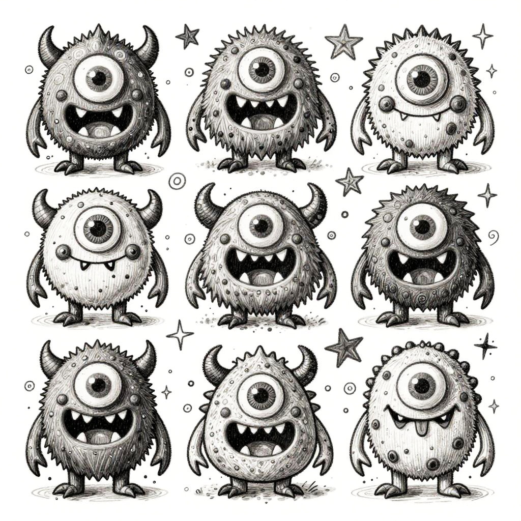 Black-and-white digital drawing of nine cartoonish, round, furry monsters with one large eye, small horns, and sharp teeth, surrounded by stars on