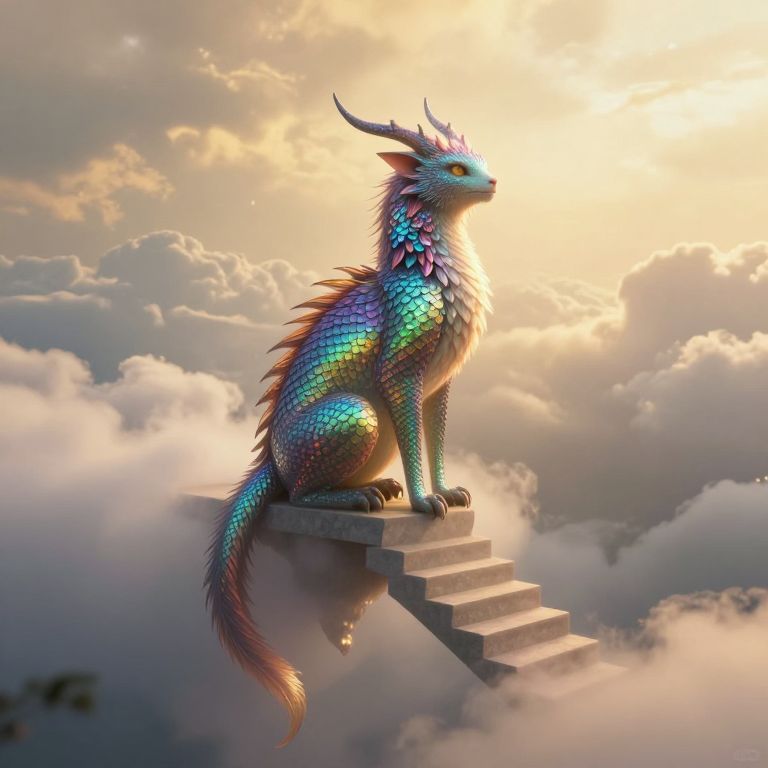A captivating portrait in the surrealistic vein, this piece portrays an awe-inspiring mythical creature perched atop an ethereal staircase that seems to float in defiance of gravity. The fantastical subject is bedecked with iridescent scales shimmering across a vibrant color spectrum, eliciting feelings of both fascination and tenderness as it gazes into the distance. Encompassed by a boundless dreamscape, this aerial view captures an otherworldly scene bathed in soft golden light filtering through nebulous clouds, creating an atmosphere rich with enigma and contemplation.