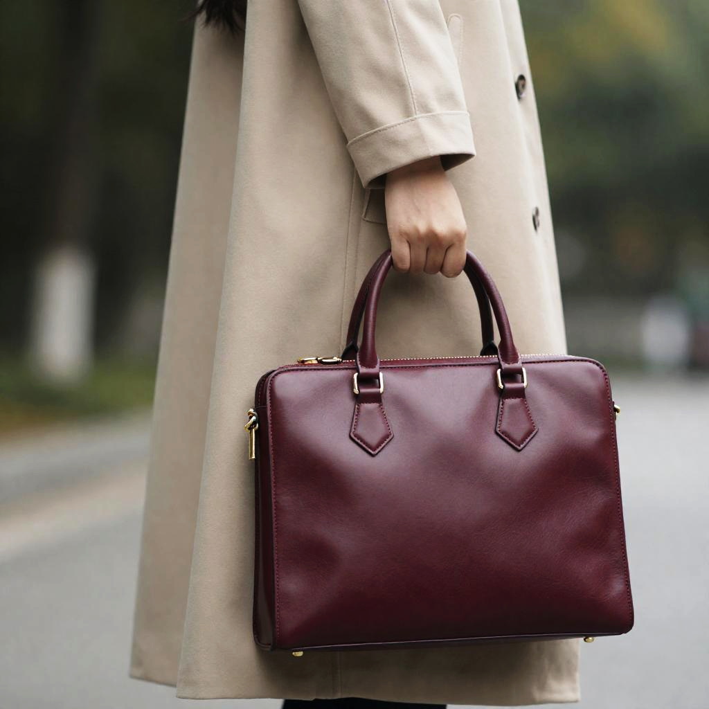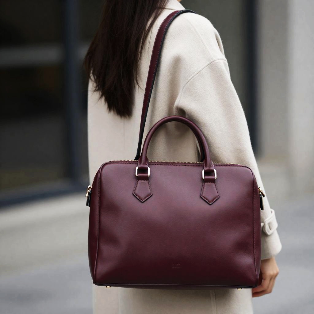 Masterpiece, best quality, photorealistic, lifelike rendering, depth of field:1.2, bokeh, film grain:1.4, 1girl, lib_bg, Bag: A structured briefcase-style handbag in burgundy leather.