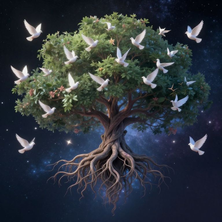 Digital artwork of a magical tree with a thick, gnarled trunk and lush green foliage, set against a starry, deep blue night sky. White doves are mid-flight around the tree, their wings spread gracefully. The tree's roots extend downward, blending into the cosmic background. Small red flowers are interspersed among the green leaves, adding a pop of color. The image has a fantasy, surreal style, with a focus on the ethereal beauty and harmony between the tree and the doves.