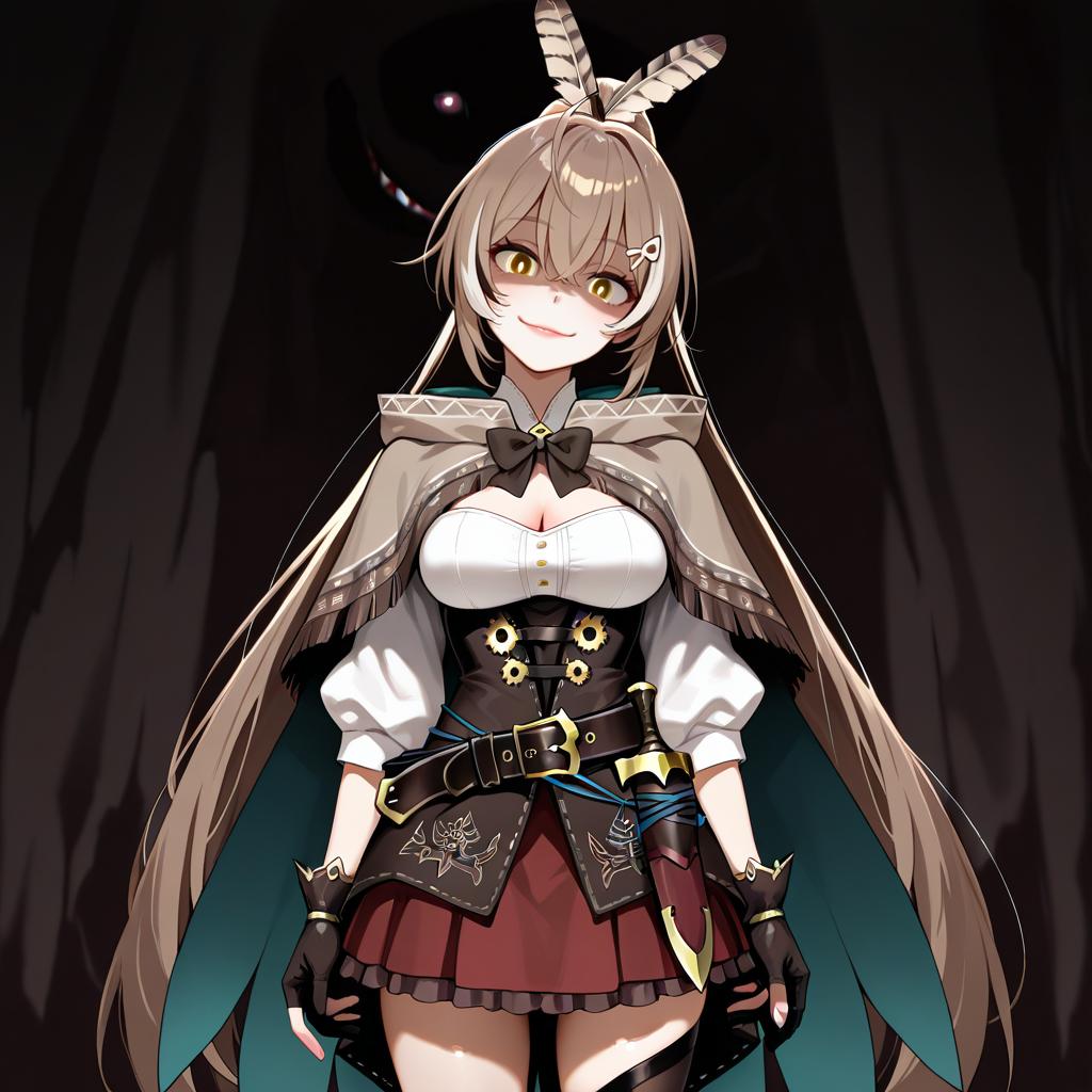 Nanashi mumei, shirt, corset, cleavage cutout, red skirt, single thighhigh, cloak, ribbon, ponytail, very long hair, hairclip, feathers, knife, belt, partially fingerless gloves, (head tilt:1.2), 1girl, (evil smile, creepy stare:1.3), constricted pupils, small pupils