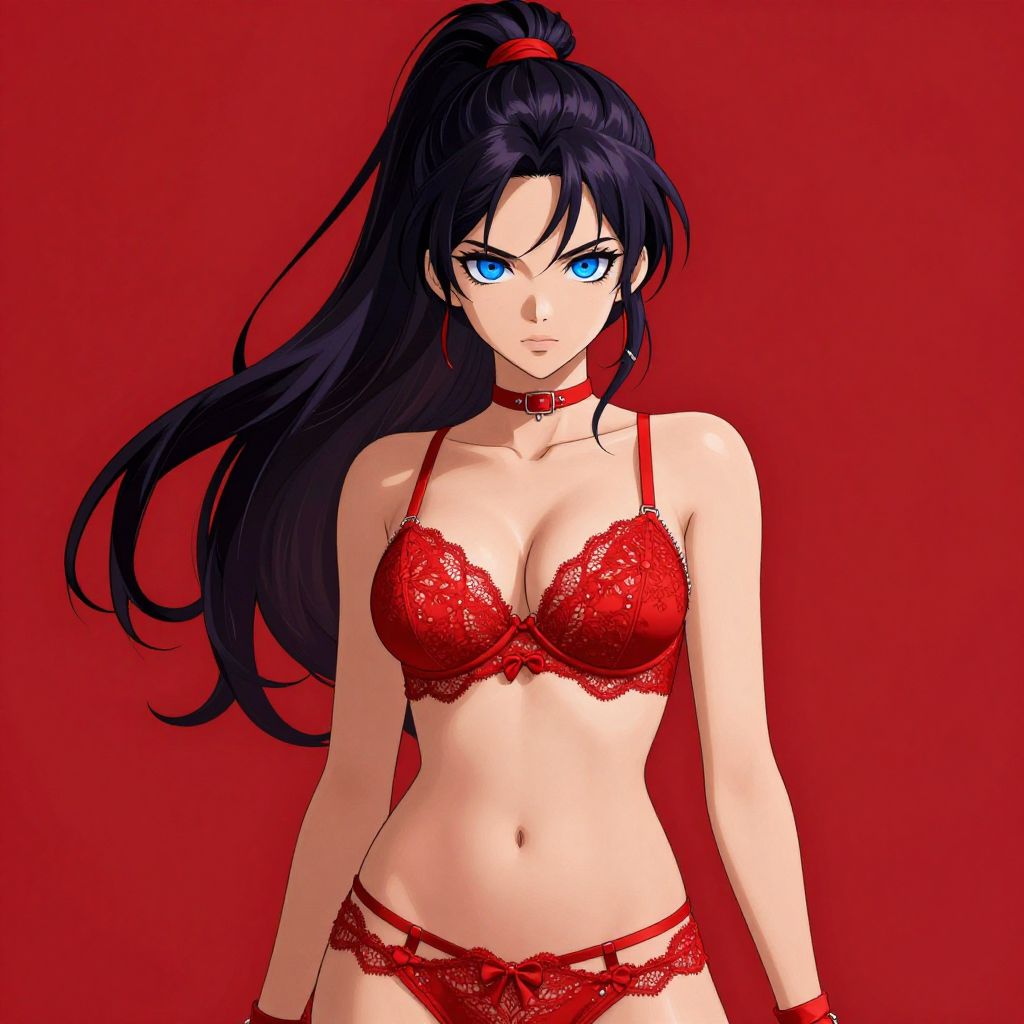 A striking digital illustration features a confident young woman with long flowing dark hair styled in a high ponytail, dressed in intricate red lace lingerie and matching accessories. The artwork showcases a highly detailed and polished anime-inspired style, emphasizing her expressive blue eyes and strong gaze against a monochromatic red background.