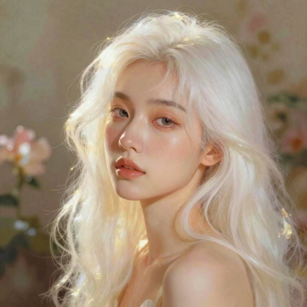 Elegant portrait of a person with white hair filter, strands catching soft sunlight, warm glows around the edges, vintage floral background fading softly, painterly brushstrokes, subtle pastel palette, a blend of realism and impressionism in digital art.