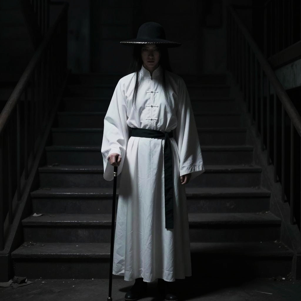 Dark and moody portrait of a person dressed in a long white flowing robe with wide sleeves and a black belt, wearing a black wide-brimmed hat with metal rim details. The figure holds a cane in their right hand and stands centered on an old, shadowy staircase in an industrial setting, creating a mysterious and eerie atmosphere.
