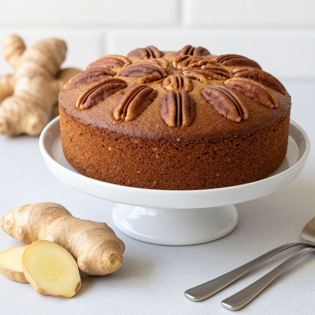 Photograph of a round, golden-brown cake with a smooth, slightly textured surface and evenly spaced, dark brown, whole nut garnishes on top. The cake is centered on a white plate, placed on a light gray surface. In the blurred background, there are two large, beige-ginger roots. The cake's surface has a subtle sheen, indicating a moist texture. The overall image has a bright, natural lighting, highlighting the cake's rich color and texture.