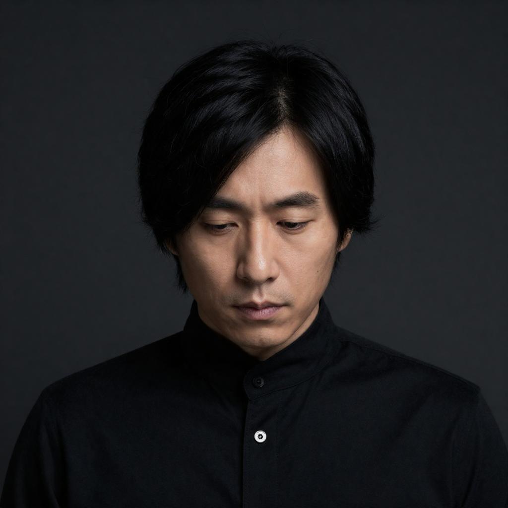 Portrait of an Asian male rock musician with dark hair, dressed in a black leather jacket with red accents, black pants, and black combat boots. He is standing confidently against a black background, holding a red electric guitar with black pickups and a red strap, arms crossed.