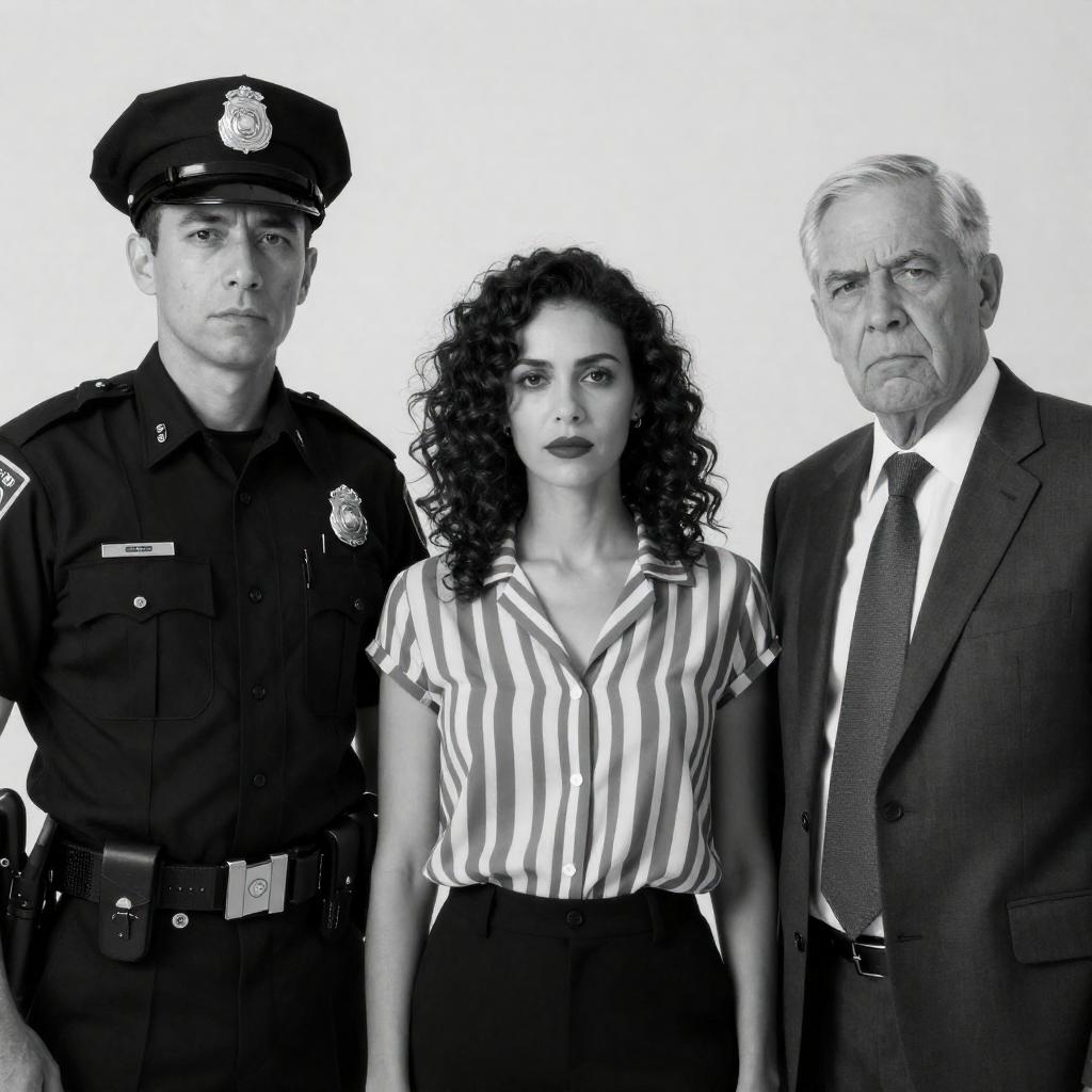 Black and white portrait of three serious-looking individuals against a neutral background. On the left stands a male police officer in full uniform with a peaked cap and badge, wearing a utility belt. In the center is a woman with curly hair, wearing a short-sleeved striped blouse and dark lipstick. On the right is an older man dressed in a dark suit, white shirt, and tie with a slightly furrowed brow. The image captures a stoic and intense group dynamic.