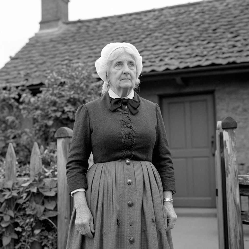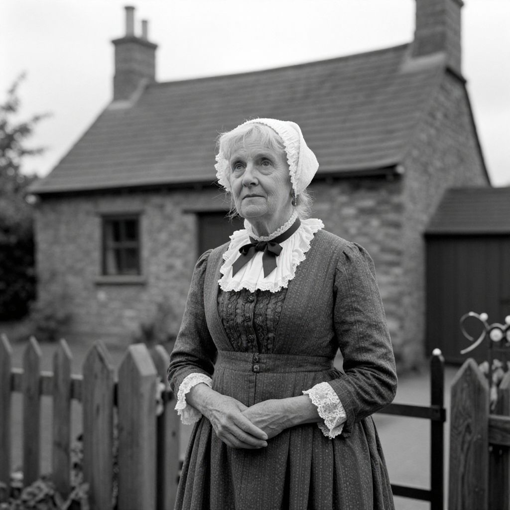 Black and white photo of an elderly woman in victorian dress and cap outside a cottage