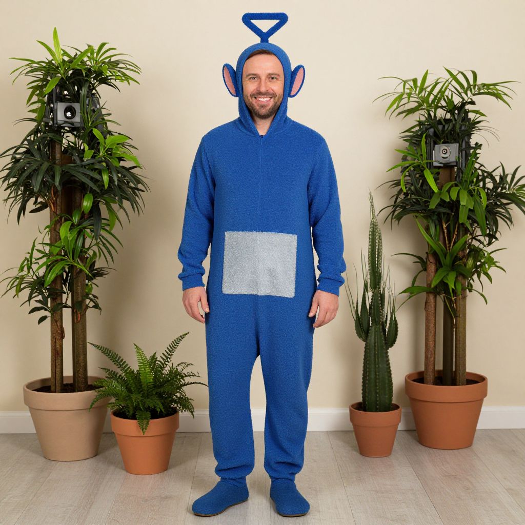 Teletubbies Onesie Adult Costume, man in a blue and blue costume standing in front of potted plants