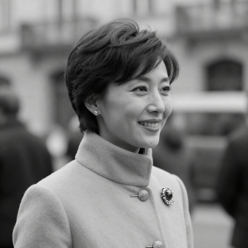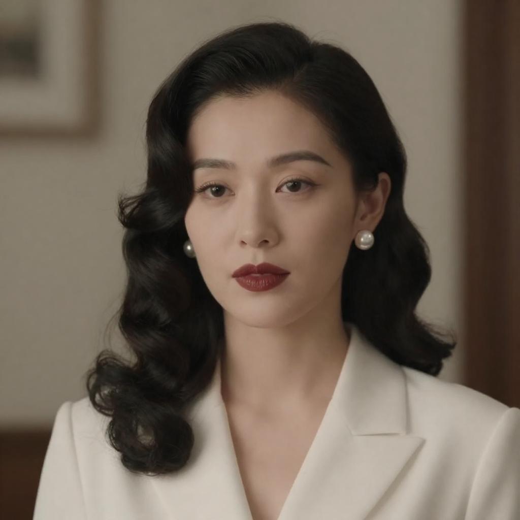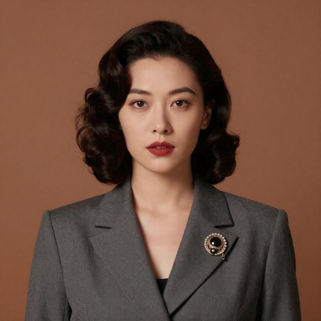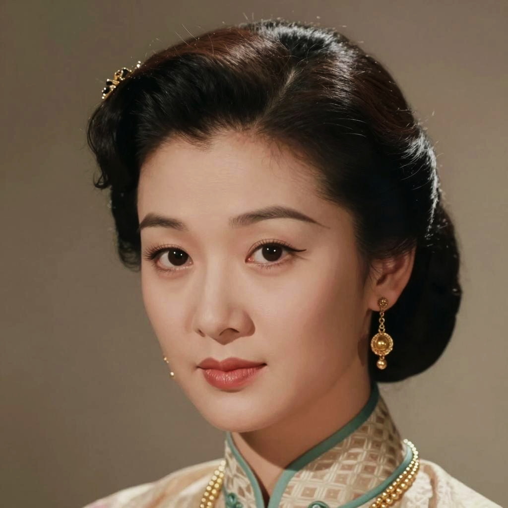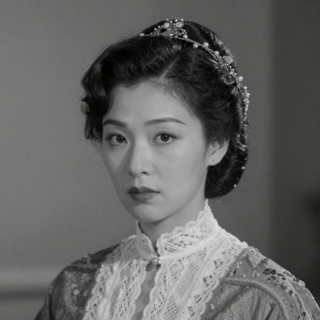 Black-and-white photograph of a woman with an elegant, vintage hairstyle adorned with a jeweled hairpiece. She has dark, arched eyebrows, large eyes, and a serious expression. She wears a high-collared, lace-trimmed garment with intricate patterns. The background is blurred, focusing attention on her face and hairstyle.