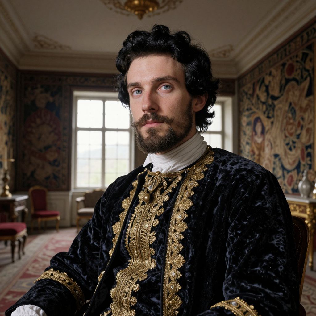 Photorealistic digital portrait of a bearded man with dark hair, wearing a black velvet robe with gold embroidery, in an ornately decorated room with