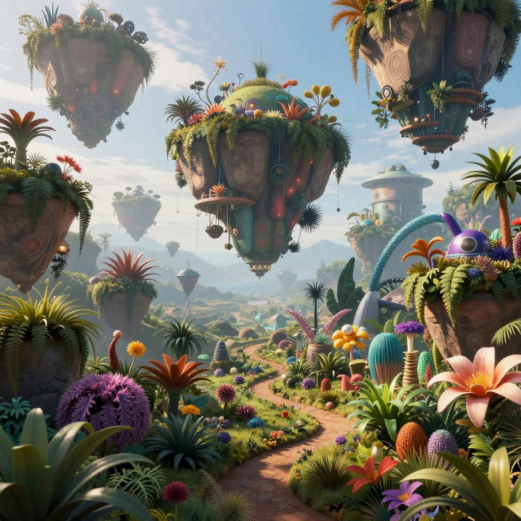 Feylost, a sprawling magical realm where reality bends, floating islands with luminous plants, delicate fey creatures fluttering among iridescent flowers, deep mist weaving through surreal landscapes, vibrant color palette, highly imaginative fantasy environment