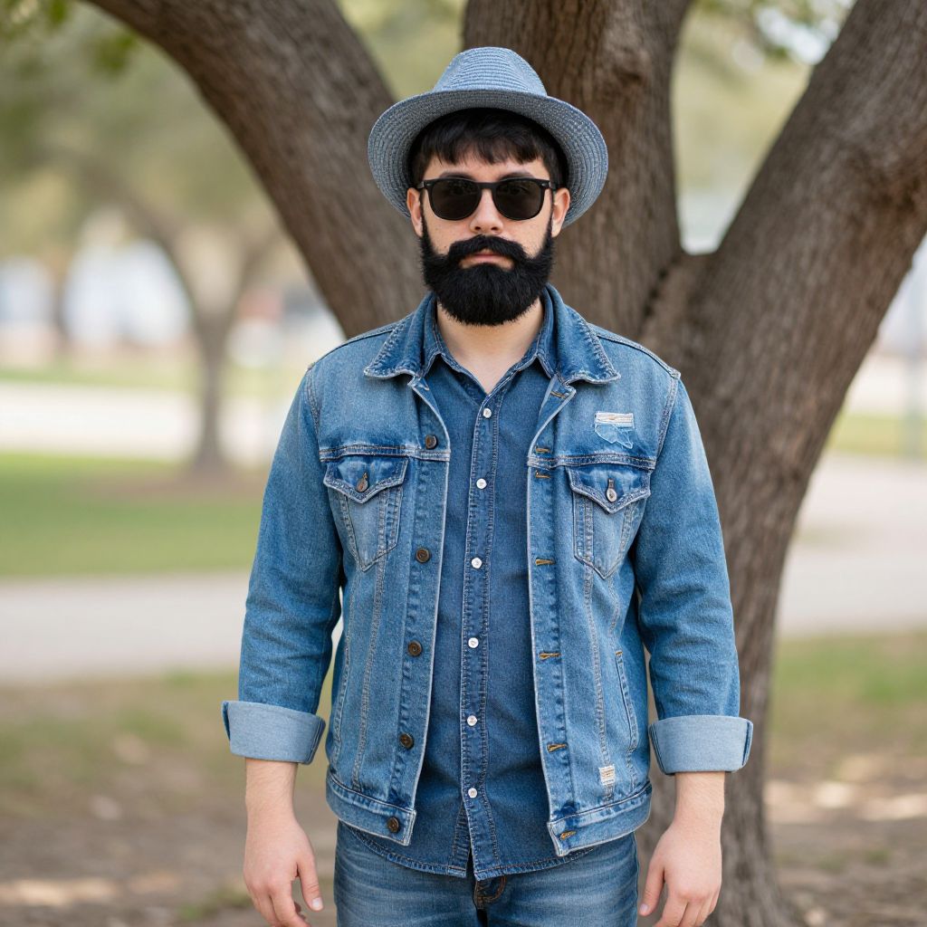 Funny homemade costume man, 1boy, male focus, solo, facial hair, denim, hat, outdoors, sunglasses, beard, glasses, tree, shirt, pocket, blurry, blurry background, black hair, denim jacket, sleeves rolled up, looking at viewer, jeans