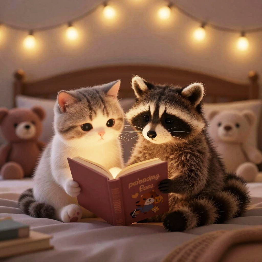 Wholesome scene of a gray and white cat and a raccoon sitting on a cozy bed, reading a storybook together. The setting features warm fairy lights and plush teddy bears in the background, creating an intimate and peaceful atmosphere with soft textures and cute character design.
