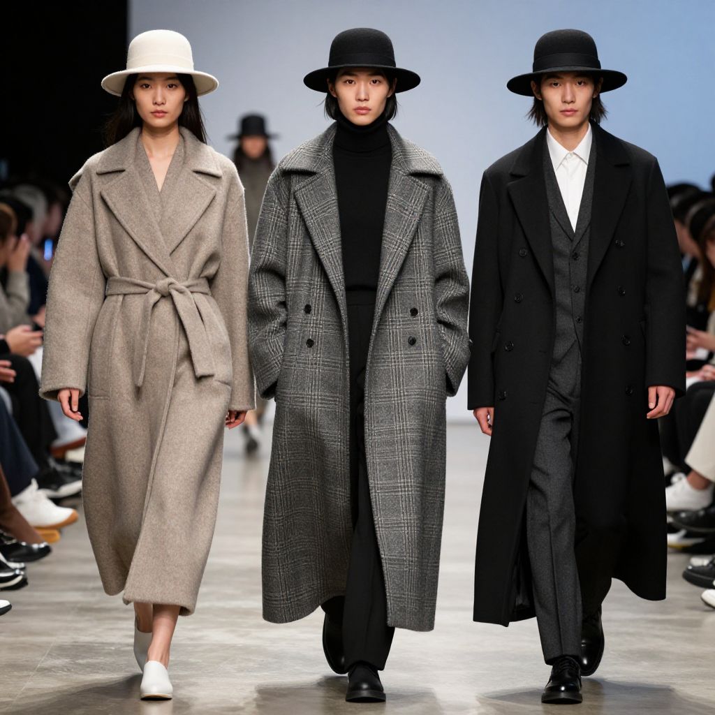 Photograph of three Asian models on a runway, wearing black hats and grey, black, and beige overcoats, with a white and black background