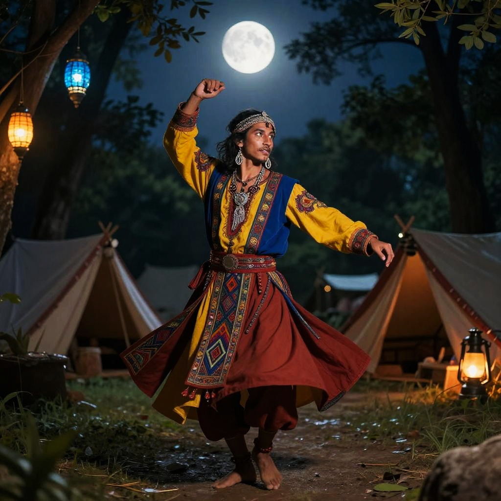Male gypsy in vibrant traditional attire dancing under moonlight in a mystical forest clearing, surrounded by colorful lanterns and rustic tents, with intricate jewelry and expressive eyes, capturing a spirited and nomadic lifestyle atmosphere.