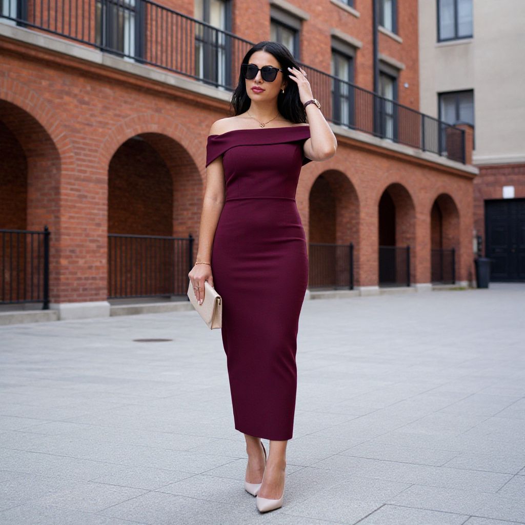 Photograph of a woman with long black hair, wearing an off-the-shoulder, form-fitting burgundy dress that reaches mid-calf, and beige pointed-toe heels. She has olive skin, is wearing dark sunglasses, and holds a white clutch in her left hand. She stands in an urban setting with a red-brick building featuring black iron railings and arched doorways in the background. The ground is paved with light gray tiles. She looks directly at the camera with a confident expression, slightly adjusting her hair with her right hand.