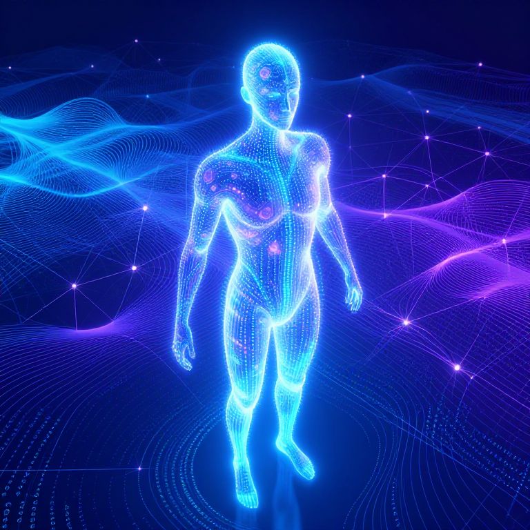 Digital CGI image of a glowing, wireframe human figure standing in a dark blue, starry background. The figure is illuminated in bright blue neon lights, showing detailed muscle and bone structure. Waves of blue and purple light surround the figure, adding a sense of movement. The background features a network of white lines and dots, resembling a cosmic or digital grid. The figure's gender is indeterminate due to the wireframe style, with visible chest and abdominal areas. The overall style is futuristic and cybernetic, combining elements of neon art and digital visualization.