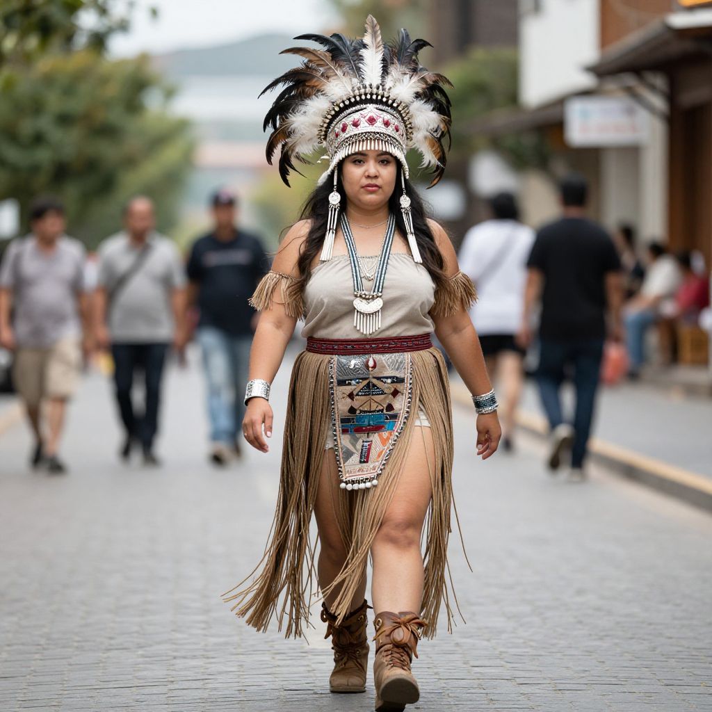 Photograph of a Latina woman walking down a urban street, wearing a traditional Native American headdress adorned with black and white feathers. She has medium brown skin and long black hair. She wears a white sleeveless top with black and red geometric patterns, and a fringe skirt that reveals her left thigh. Her accessories include silver bracelets, a beaded belt, and brown fringe boots. The background shows a blurred crowd of people and buildings, with a mix of greenery and urban elements. The street is paved with gray bricks. The overall image has a vibrant, slightly surreal quality.