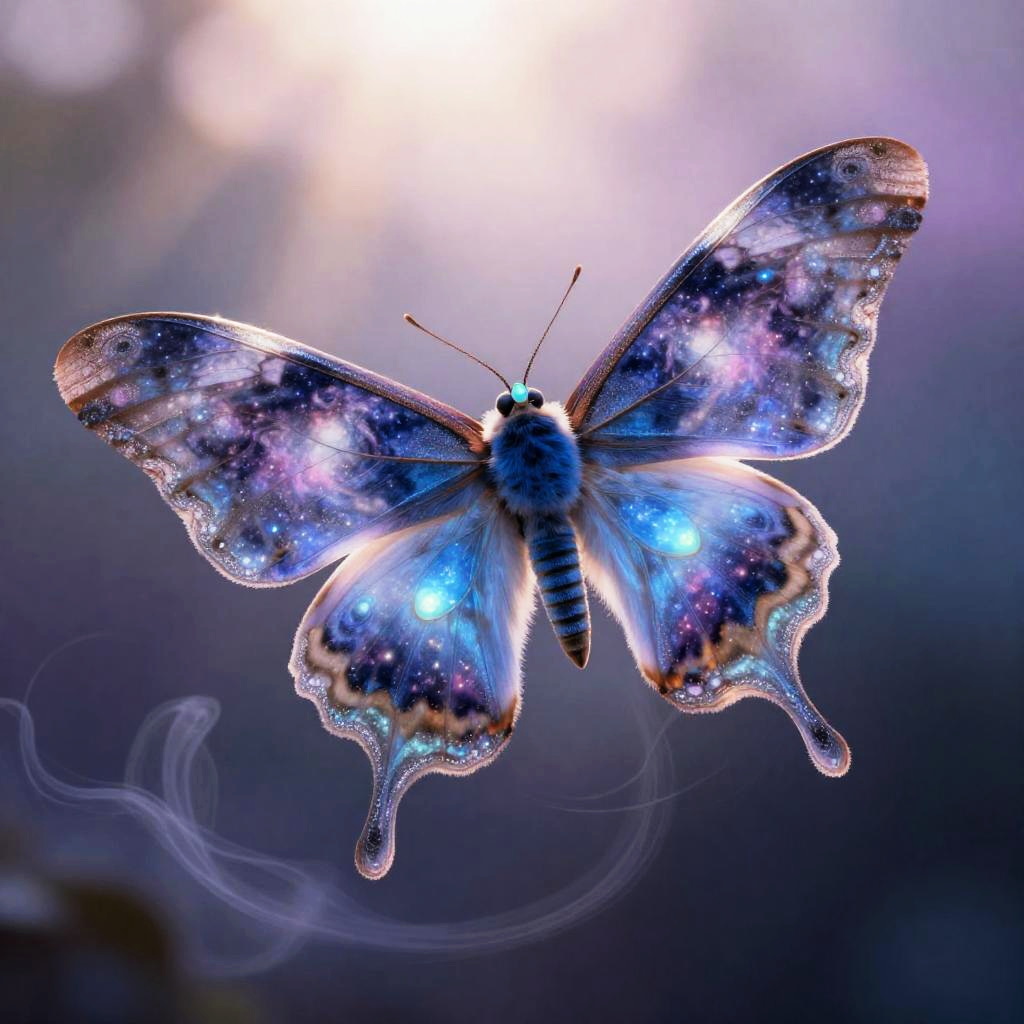 A bioluminescent luna-moth guardian with velvet indigo fur and opaline antennae hovers gracefully amidst a whirlwind of velvet wings patterned like swirling galaxies and nebulae, rimmed with luminescent lace and fine silver dust, shimmering softly in pastel hues. Sunlight dances across her form, casting a mesmerizing play of shadows, as delicate strands of mist curl around her, set against a radiant, gradient-hued backdrop, evoking the enchanting style of Loish.