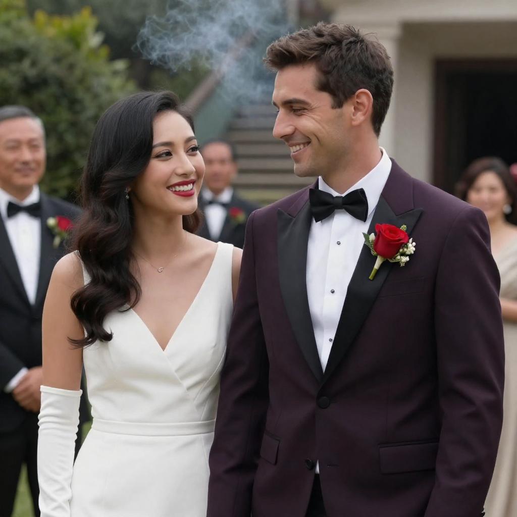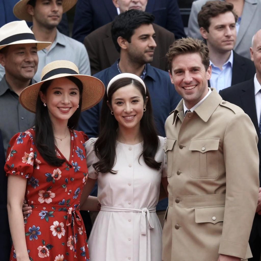 Photograph of a crowd, focusing on three people in the front. Two women, one with red floral dress and hat, the other in cream dress with headband, smiling. Man in beige military-style coat, brown hair, smiling. Background people in casual attire, some with hats. Crowded, outdoor setting, people interacting closely, smiling.
