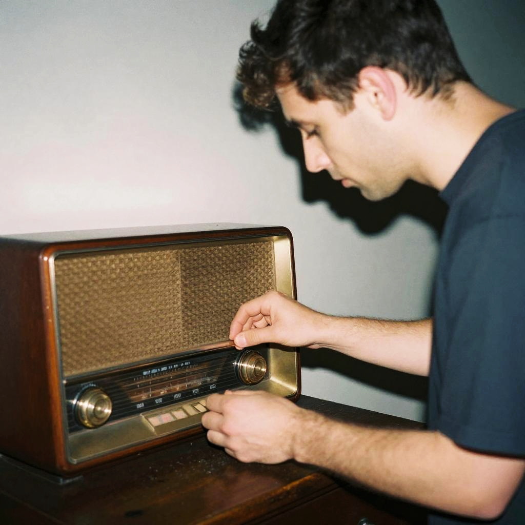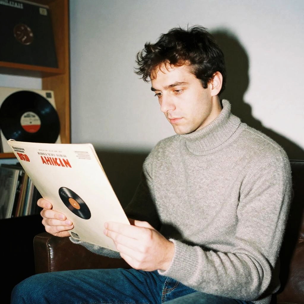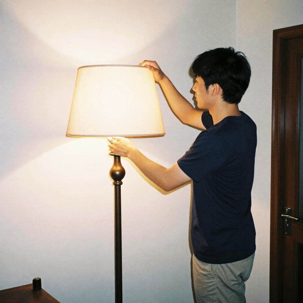 Realistic film photograph taken with direct flash with overexposure and hard shadows, the photograph shows a man standing beside a vintage floor lamp adjusting the shade, vintage interior. Vibe is offbeat and cinematic.