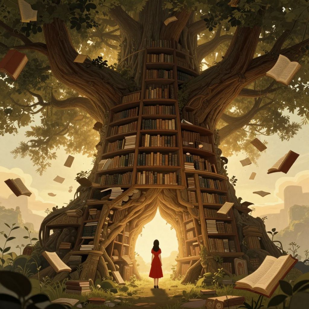 A fantastical digital illustration depicts an ancient library seamlessly integrated into the gnarled trunk of a colossal tree, with floating books cascading around it like whispers of timeless stories, as a young woman in a red dress stands in awe beneath the ethereal, golden-hour light.