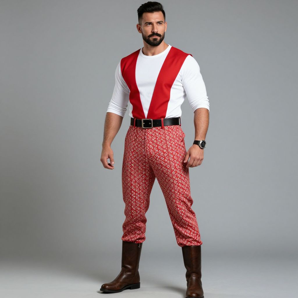 A man wearing a red and white costume with patterned pants and boots, with a beard and mustache, wearing a watch on his wrist. The man has a strong, confident presence, exuding a sense of authority and charm. His red and white outfit is well-fitted, highlighting his muscular physique and athletic build. The patterned pants add a touch of sophistication, while the boots emphasize his rugged, outdoorsy demeanor. The watch on his wrist adds a subtle touch of elegance, balancing his bold costume with a refined accessory. The overall image captures a sense of adventure and style, making him a memorable and distinctive character.