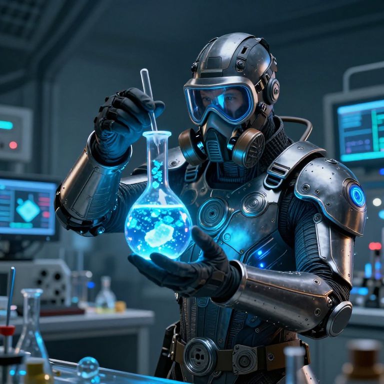 A digitally rendered image depicts a futuristic scientist in a metallic, armored suit with glowing blue accents, standing in a high-tech laboratory. The scientist, wearing a reflective helmet with a blue-tinted visor, holds a glowing blue liquid in a glass flask with one hand and a test tube with the other. The suit features intricate mechanical details and blue glowing panels. The background showcases a lab with various scientific instruments, computer screens, and test tubes on a counter. The overall color scheme is dominated by cool blues and metallic grays, creating a sci-fi atmosphere.